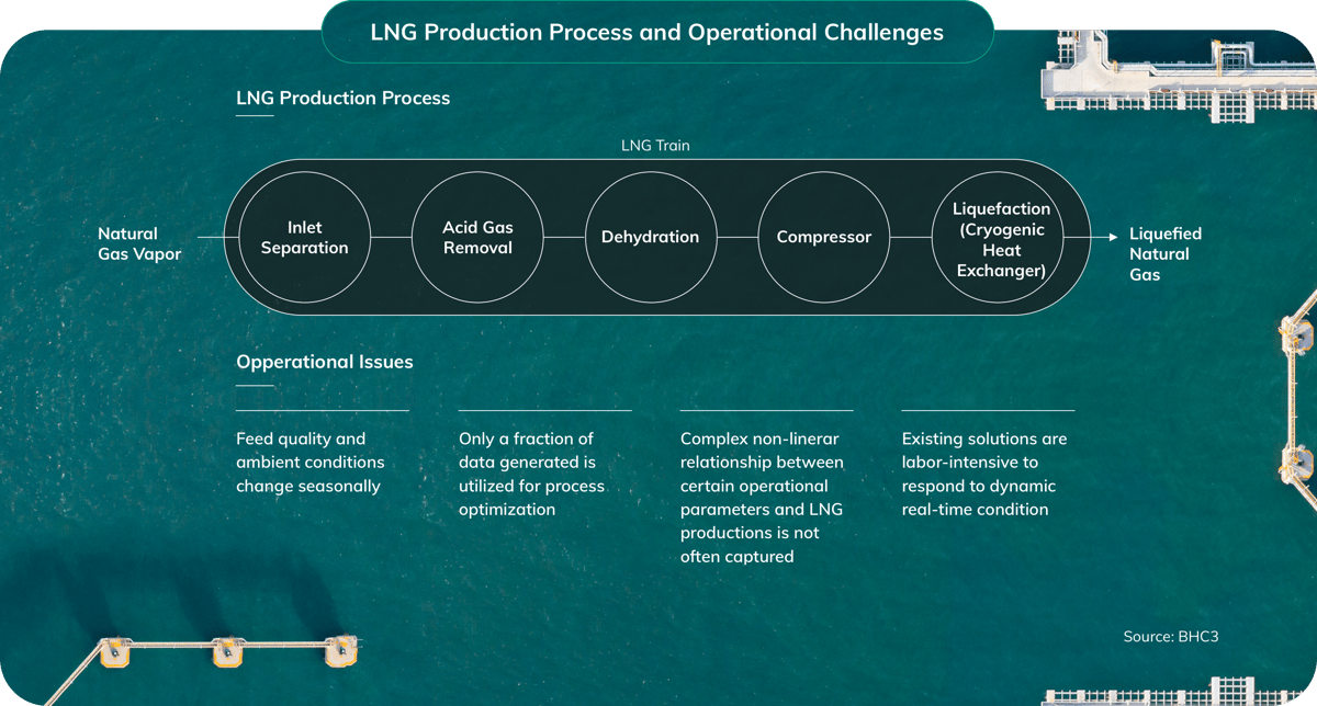 LNG plants are complex and face operational challenges that limit production capacity and reduce energy efficiency. For example, feed quality and ambient conditions change seasonally. Only a fraction of the data generated is utilized. Optimizing the complex, non-linear relationship between inputs and production is often missed by traditional process-control systems. Finally, existing process optimization solutions are too labor-intensive to respond to dynamic, real-time conditions.