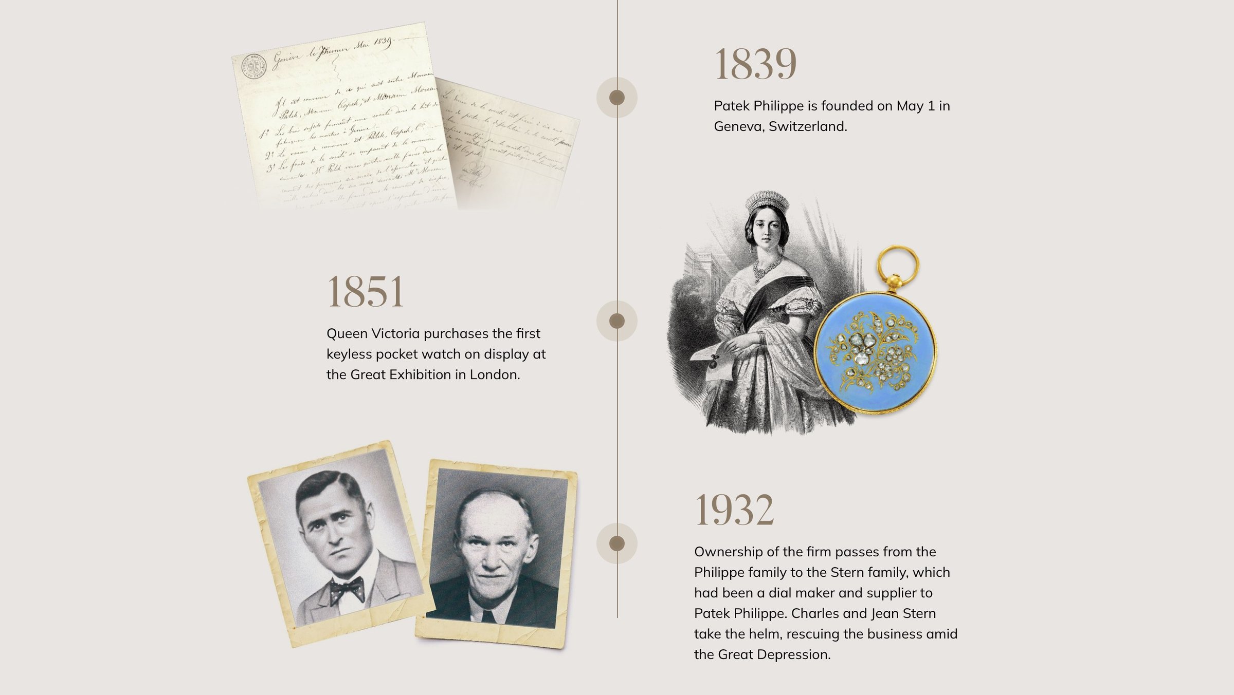 Patek Philippe was established in 1839, when the company became part of Geneva’s proud watchmaking community. The first timepieces created by Patek Philippe were pocket watches and were coveted by European royalty; Queen Victoria purchased one in 1851 after seeing it on display at the Great Exhibition in London.