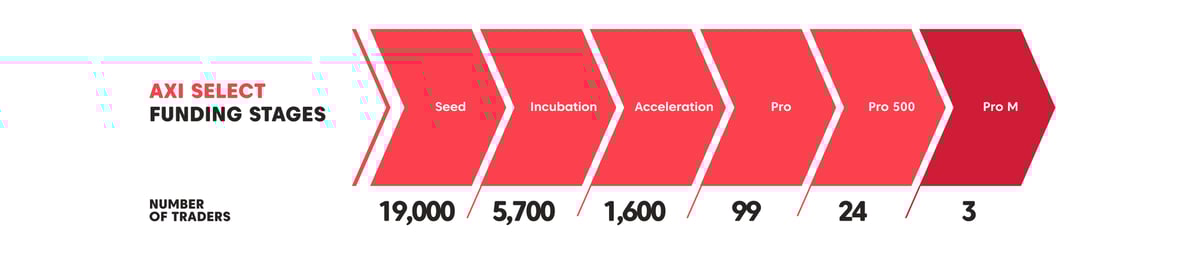 But progression through the funding stages is intentionally tough. Of those 30,000 traders, 19,000 have reached the Seed stage, 5,700 have moved to Incubation, 1,600 to Acceleration, 99 to Pro, and 24 to Pro 500. Only three have reached the highest level—Pro M.