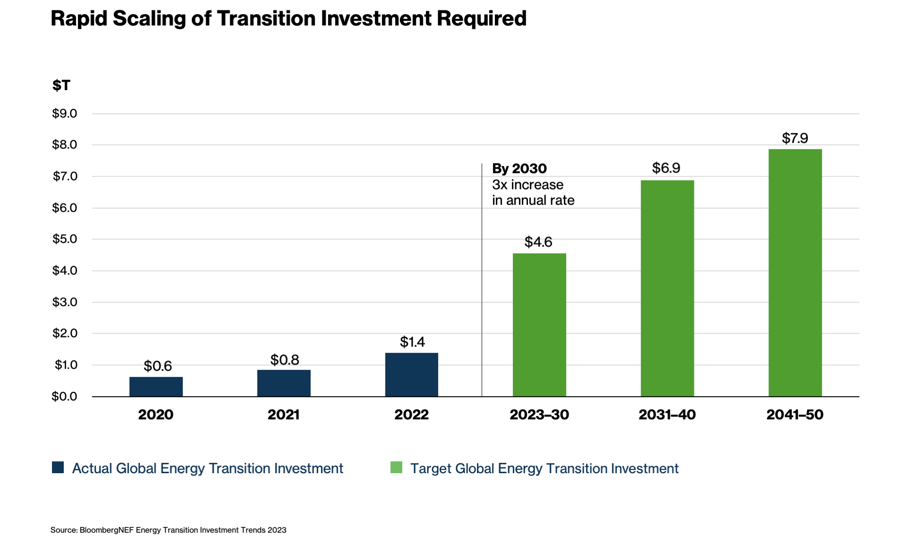 According to BloombergNEF, more than $200 trillion needs to be invested in clean energy supply and associated infrastructure between now and 2050. Annual investment rates must triple during this decade and increase fivefold by mid-century.