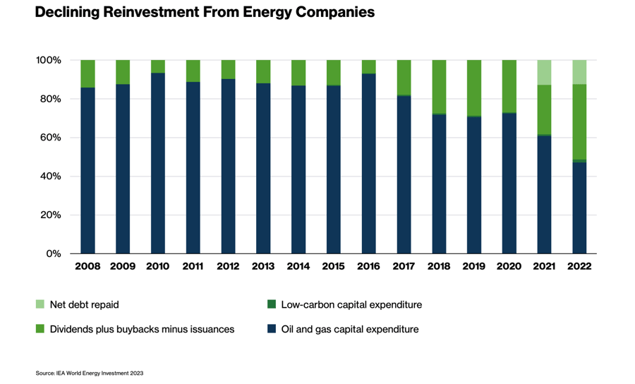 But in ratio terms, this still represents just one dollar in clean energy for every two dollars they spend in fossil fuels. That is far too little to meet the goal. And the sector is reinvesting less, putting just 50% of its available cash into new projects in recent years, down from above 80% historically.