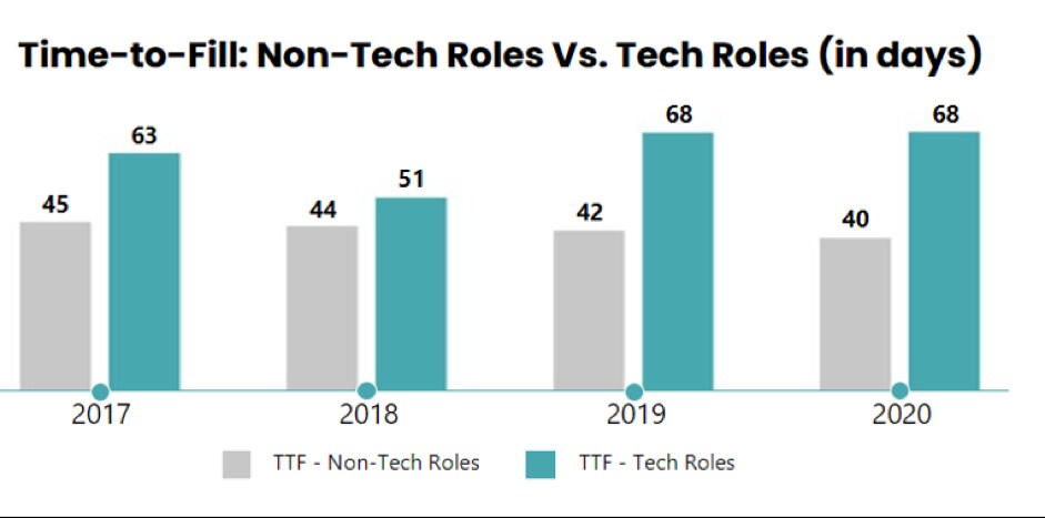 We’re seeing this trend mirrored within iCIMS’ Talent Cloud, the leading cloud platform for recruiting, which processes 3 million job postings, 75 million applications and 4 million hires per year. Recent interactions within Talent Cloud show that in 2020, it has taken employers an average of 68 days to fill a tech role–which is nearly 70% more than the average 40 days it has taken to fill a non-tech role.