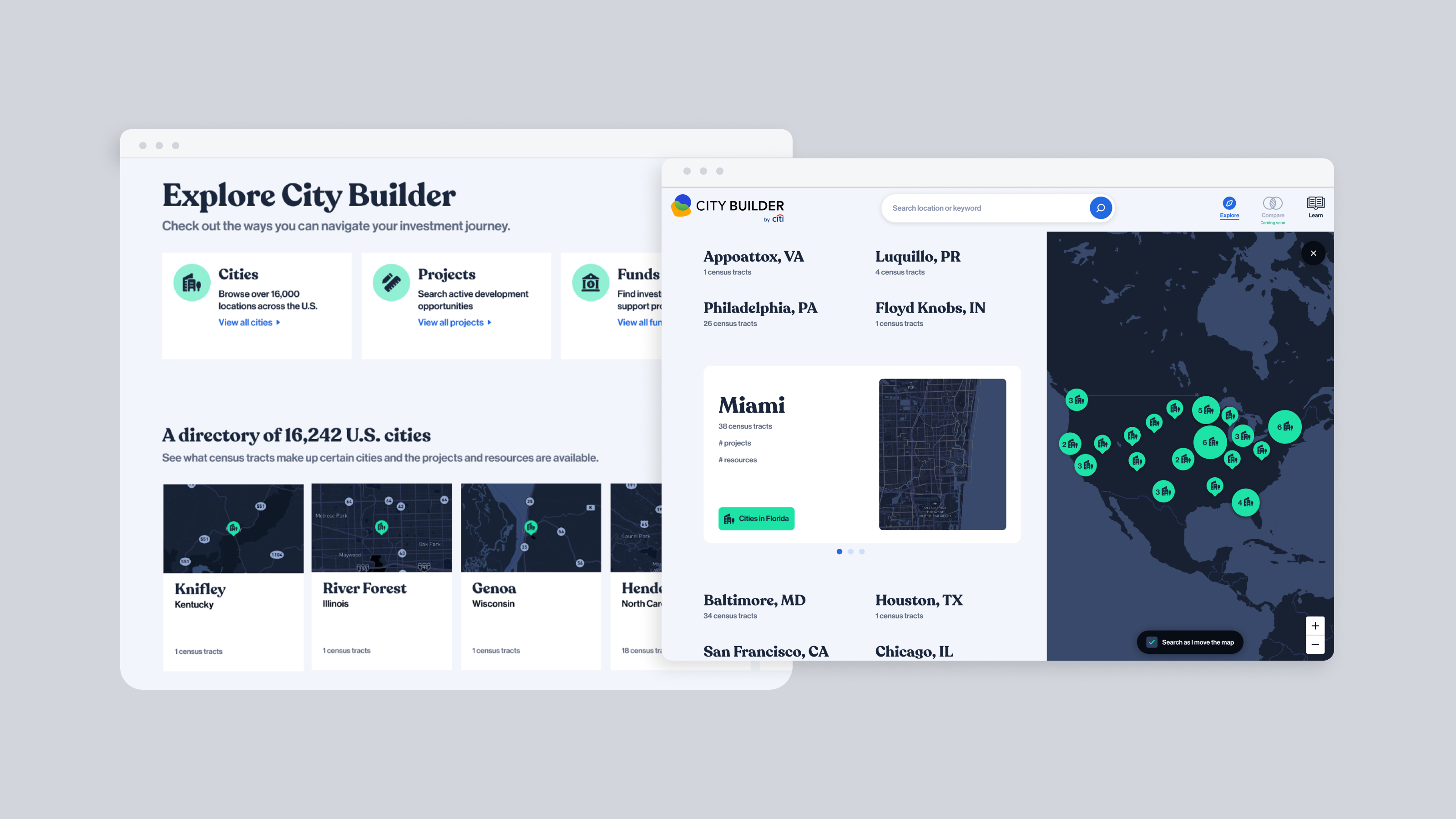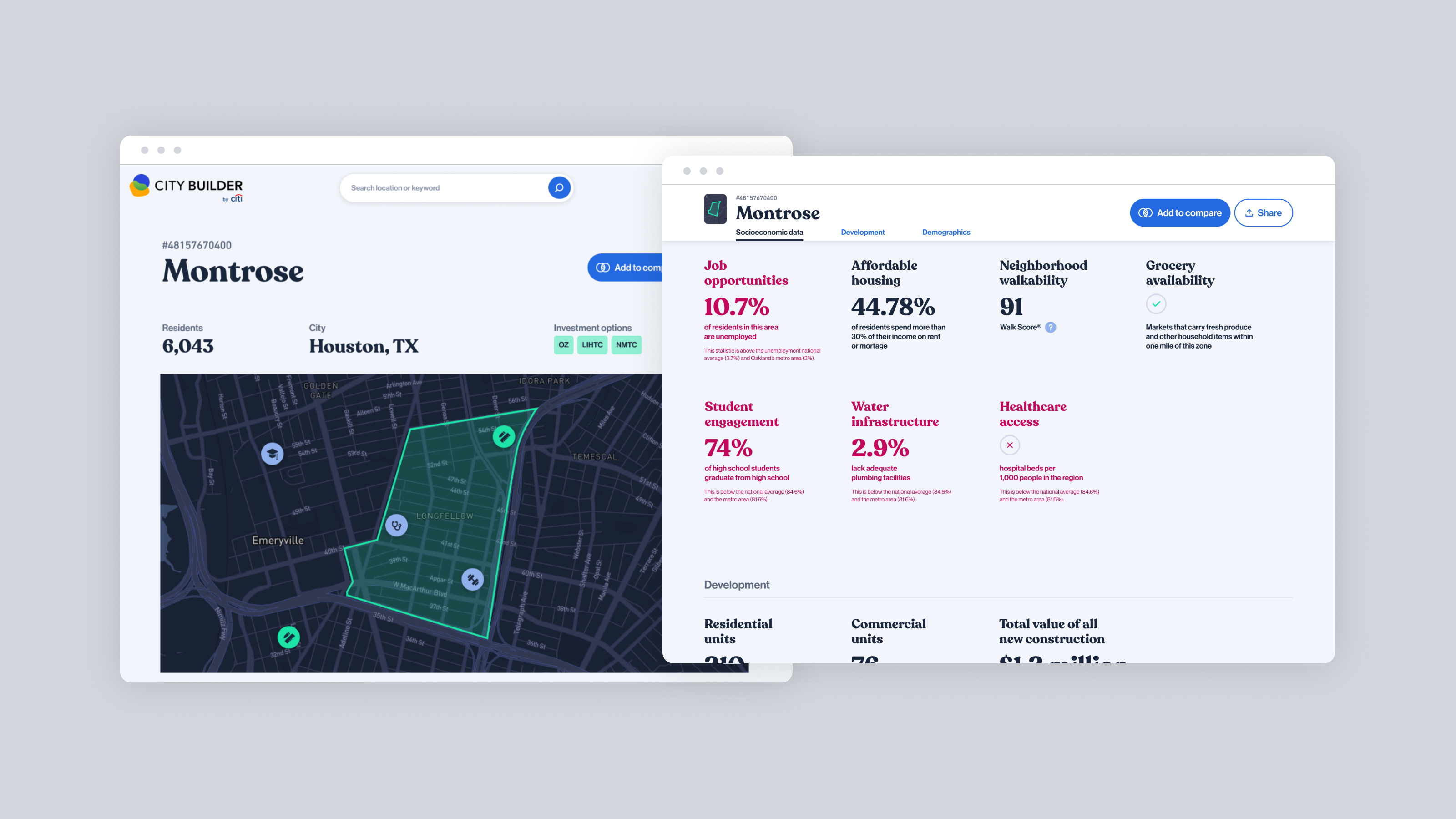 City Builder ® by Citi was created to meet this challenge. A free online tool developed by Citi Ventures Studio, City Builder is designed to give investors rapid and unique insights into place-based investment opportunities across the United States, including over 16,000 locations and 484 community development projects sourced from municipal prospectuses.