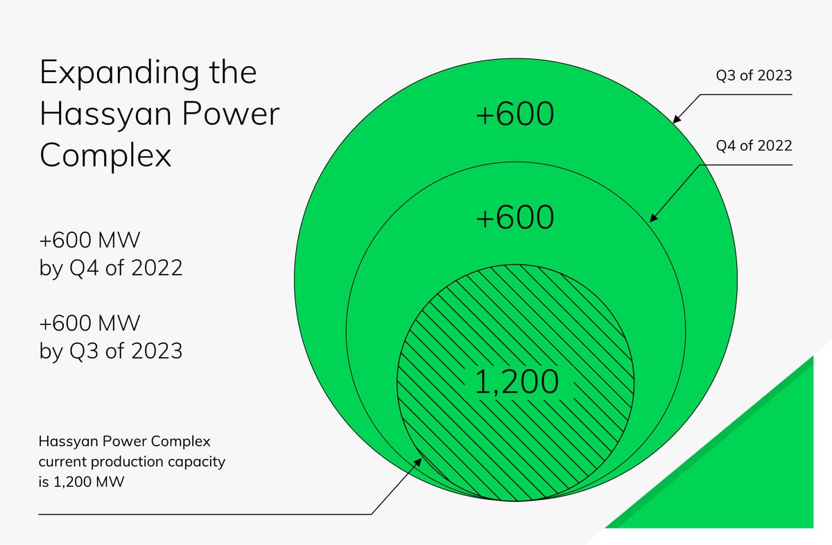 The current production capacity of the Hassyan Power Complex is 1,200 MW, using the independent power producer (IPP) model, and a further 600 MW will be added in Q4 of 2022, with an additional 600 MW added by Q3 of 2023.