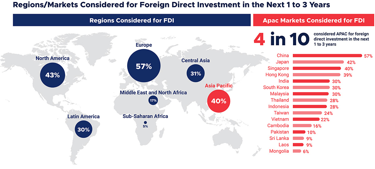 Among FDIs worldwide, four in 10 are looking at investments in Asia-Pacific over the next one-to-three years. And when they look at Asia, Singapore is among the top three destinations they have in mind.