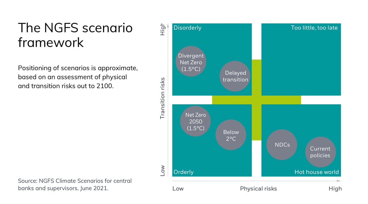 The framework underpinning Fidelity’s strategic asset allocation process is one collated by the Network for Greening the Financial System (NGFS)—a collective of central banks and financial supervisors that develops environmental and climate-focused risk management to move the financial system toward supporting a sustainable global economy.