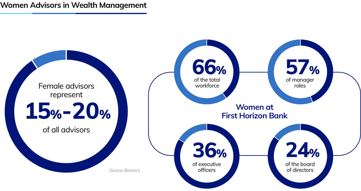 In an industry where, according to Barron’s, female advisors represent just 15%–20% of all advisors, women at First Horizon Bank represent 66% of the total workforce, 57% of manager roles, 36% of executive officers and 24% of the board of directors.5