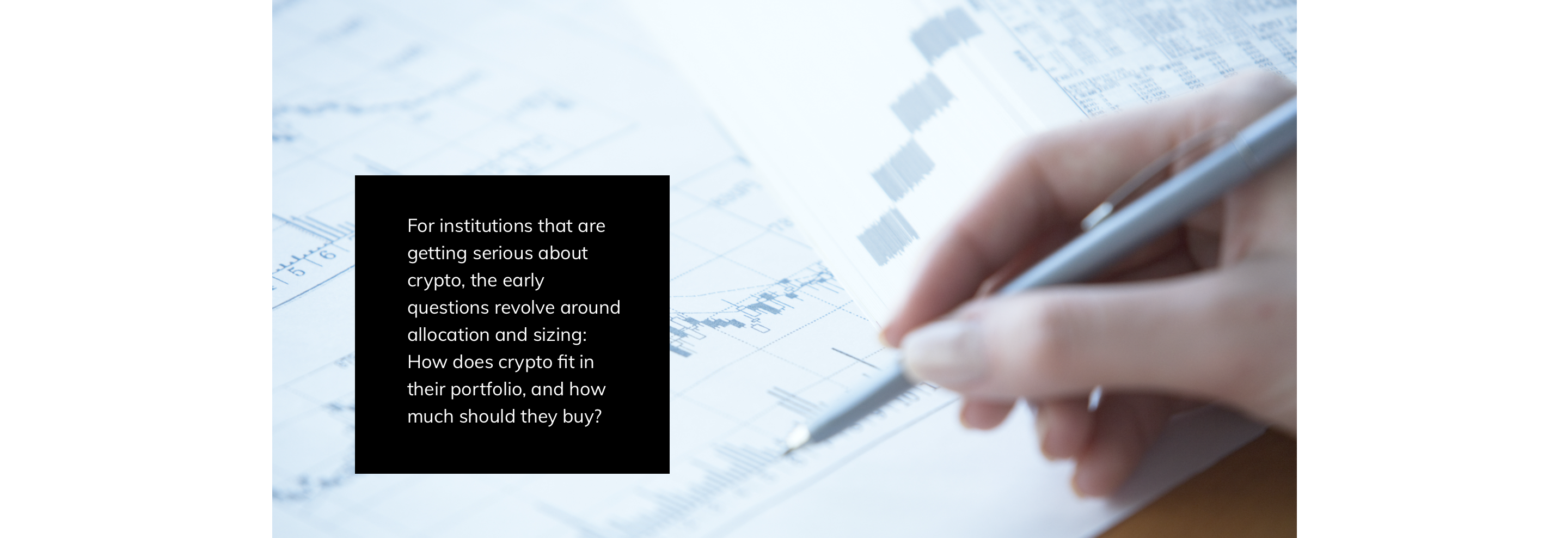 That still leaves investment due diligence. For institutions that are getting serious about crypto, the early questions revolve around allocation and sizing: How does crypto fit in their portfolio, and how much should they buy?