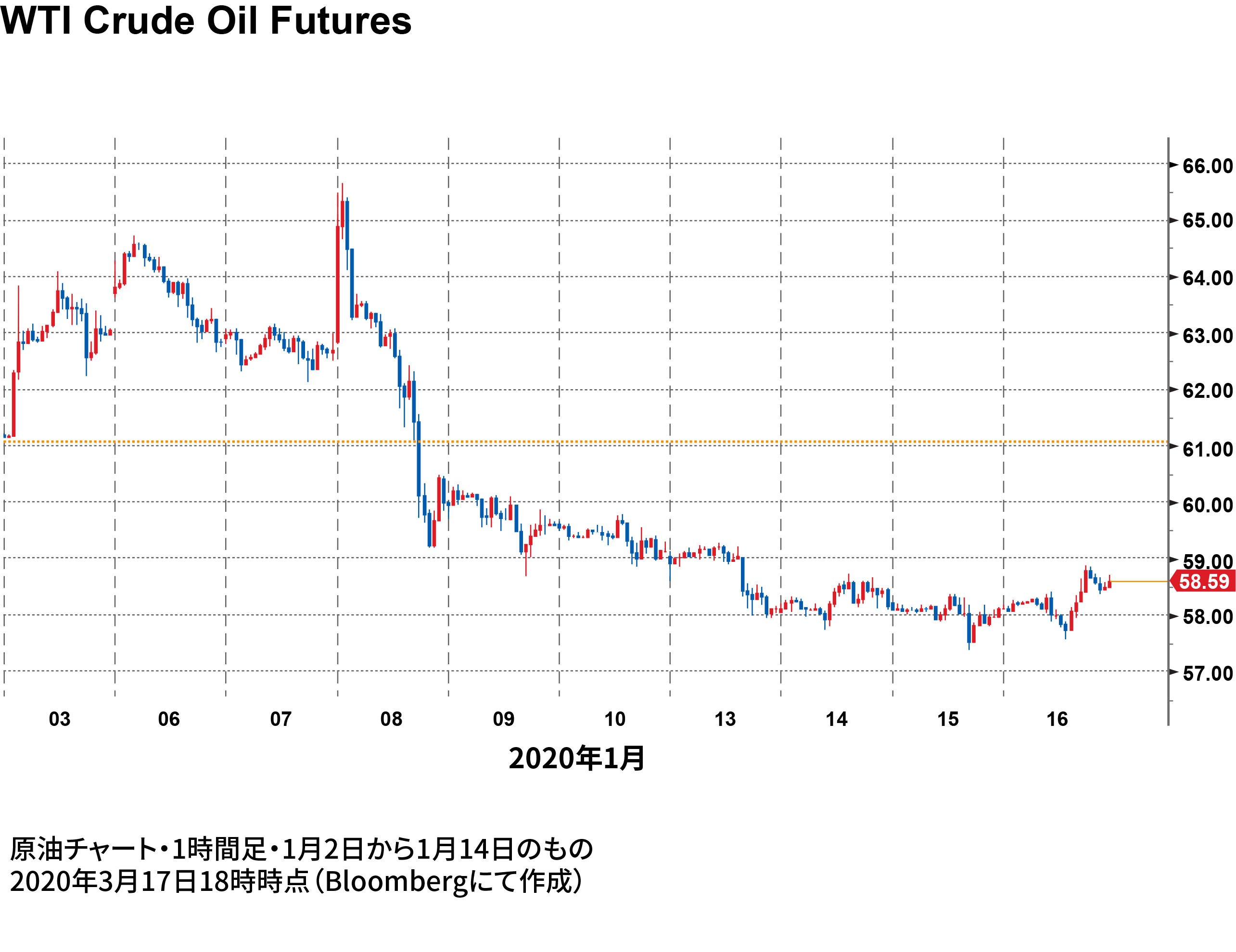 2020年1月3日、米国によるイランのカセム・ソレイマニ司令官の殺害が起こった。この事件により米国と中東は緊張状態となり、原油は大きく上昇基調となった。昨年末の終値61.06ドルに対し、8日の最高値は65.65ドルと、約4ドルの上昇となった。しかし、同日、トランプ米大統領が演説で戦争の意思がないと発言した直後に原油は急落。翌9日の最安値は58.66ドルまで値を下げた。その後、リスク回避により買われた原油は売り戻され、14日の安値は57.72ドルとなった。1週間程度で7ドル以上の値動きがあったことになる。(※1)