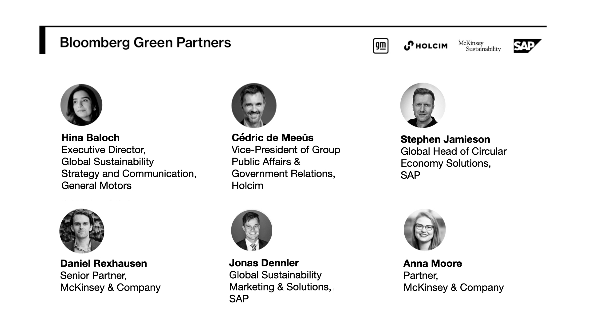 Bloomberg Green Partners from the transportation (General Motors), construction (Holcim), consultancy (McKinsey & Company) and technology (SAP) sectors recently convened in London to discuss the priorities and urgency of COP27, and the key themes and opportunities to watch.