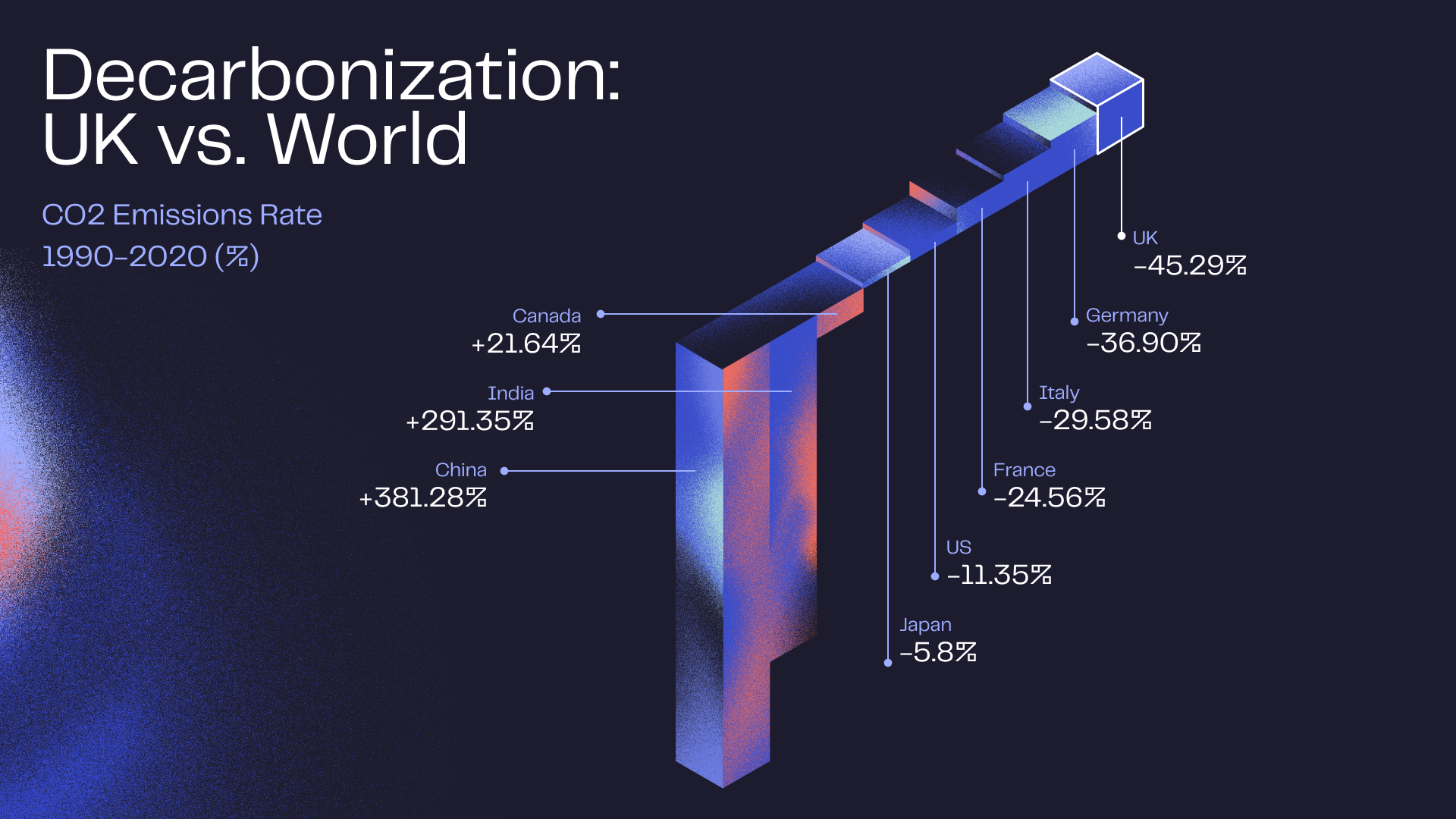 In recent years, the UK has rapidly reduced its dependence on coal while increasing its share of electricity generated from wind, solar and nuclear power. The UK hosts the world’s largest offshore wind farm, and wind recently became the country’s largest single source of installed power capacity. With a view of unlocking future technologies, the UK’s Net Zero Investment Roadmap also has ambitious plans for harnessing hydrogen power, as well as deploying carbon capture technology that will store up to 450 million metric tons of CO2 by 2035.