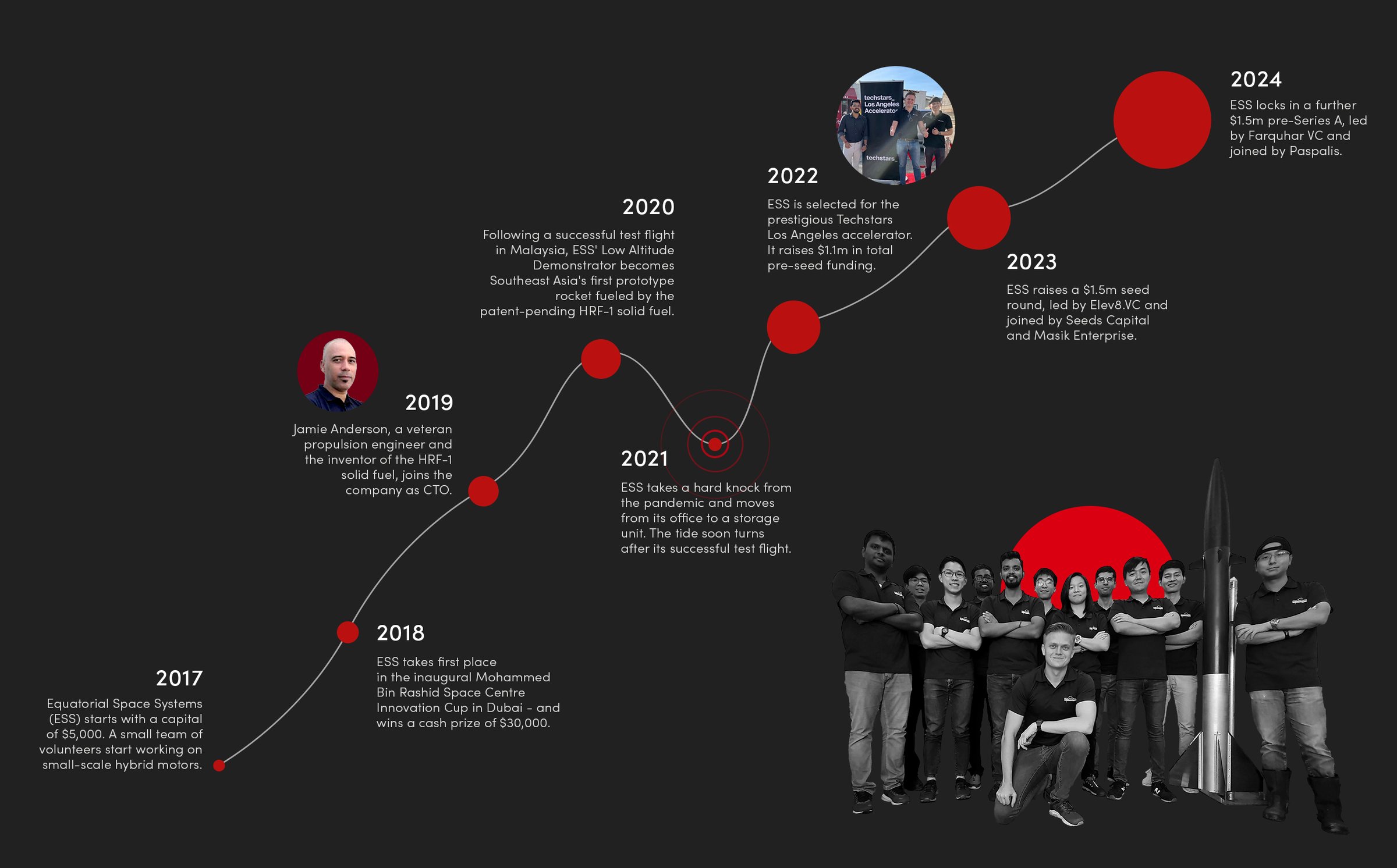 The successful test flight ushered in a series of early grants, angel investments and acceptance into three global accelerator programs, including the Techstars Los Angeles Accelerator 2022. It was this experience that Gwozdz credits with transforming a passion-driven ideal into a marketable game plan, from defensible intellectual property to thinking in terms of return-on-investment. But Equatorial Space Systems knows it will take many more years to build the company to the point of exit.