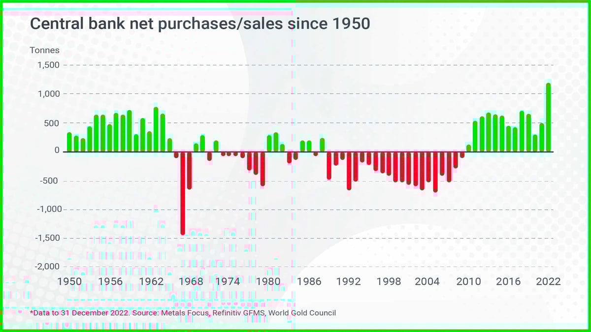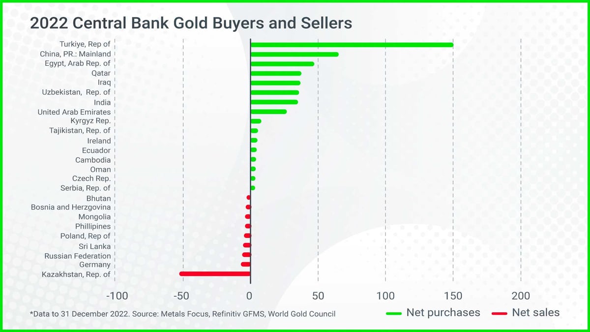 The World Gold Council data shows that central bank gold purchases rose to record levels in 2022. Central banks purchased about 1,100 tonnes of gold on a net basis in 2022.
