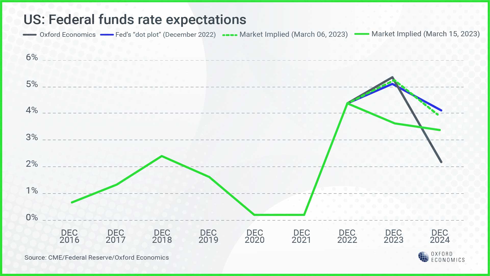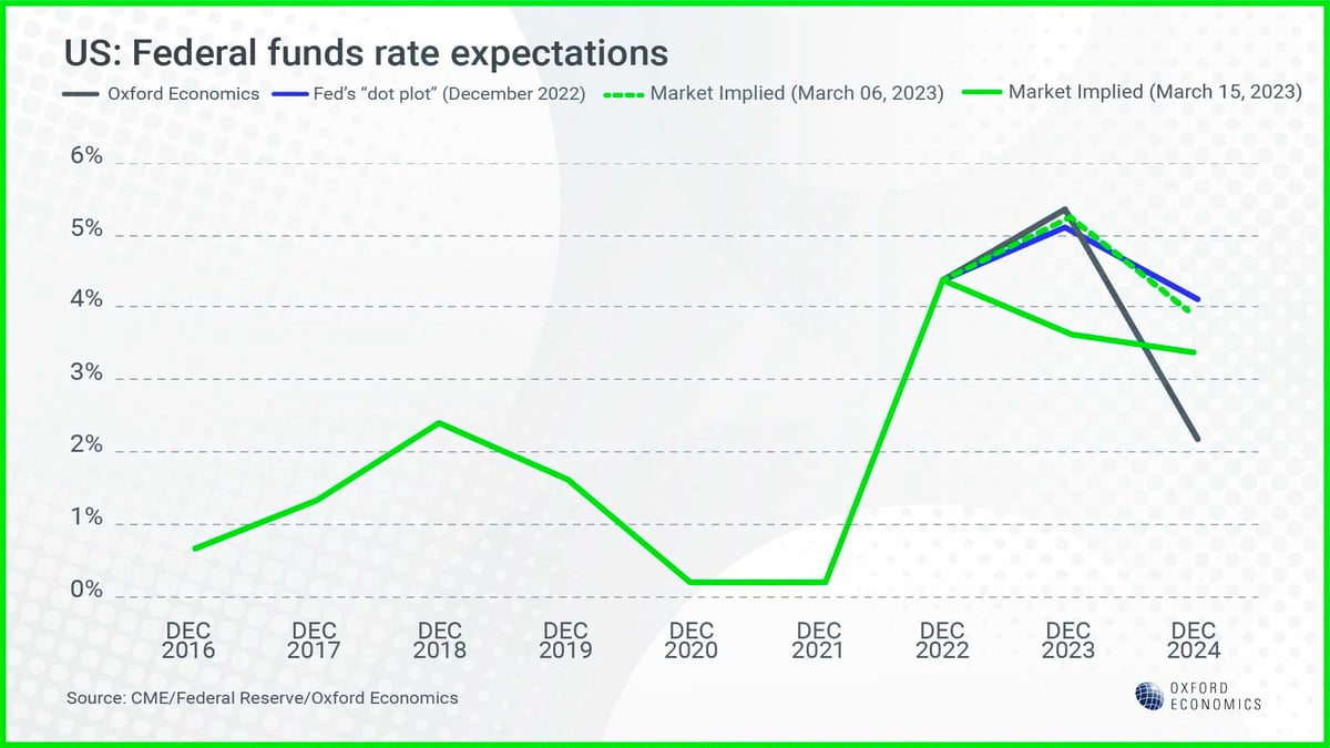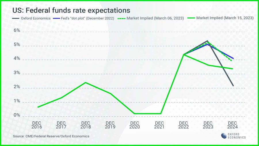Oxford Economics is forecasting another 50 basis points of rate increases, before the Federal Reserve begins to cut rates by the end of the year.