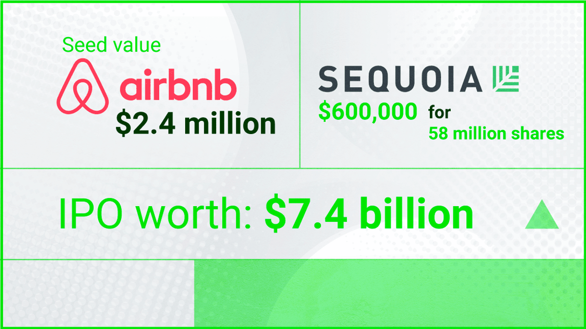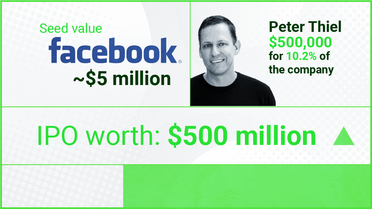 Peter Thiel famously invested $500,000 for just over 10% of Facebook, which at IPO would have been worth $500 million.