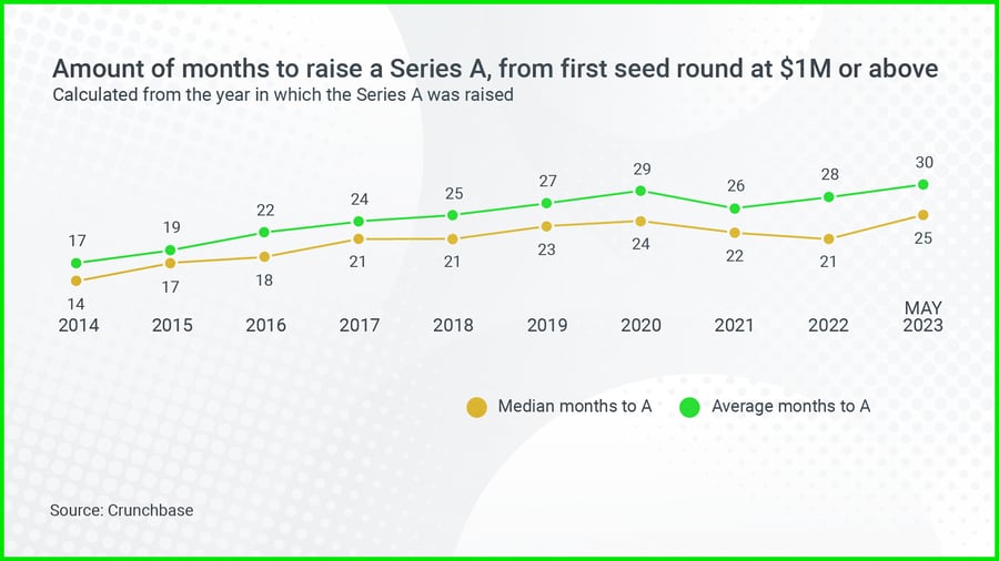 The average time from seed to Series A has almost doubled over the last decade, from 17 months to 30 months.