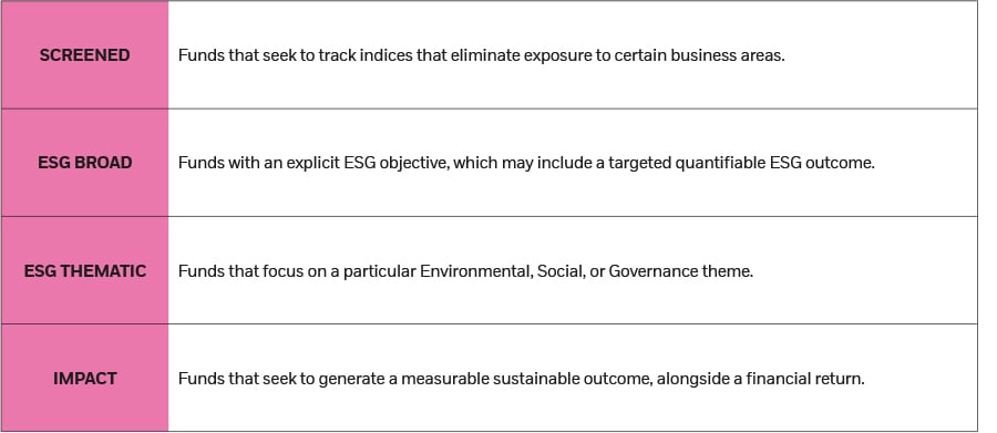 The BlackRock Sustainable Investing framework classifies iShares ETFs and index products according to four sustainable approaches.