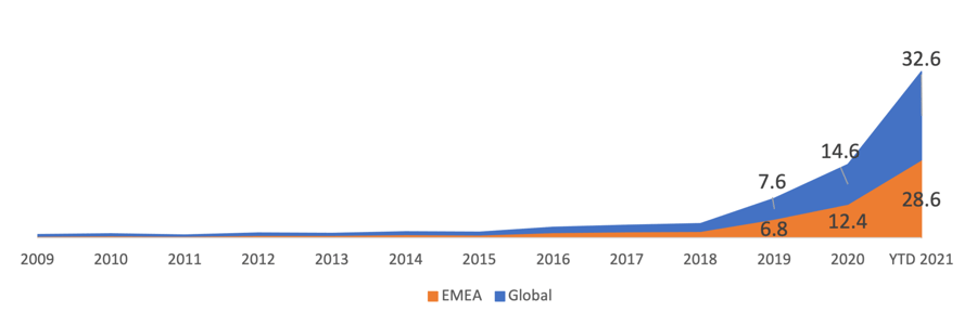 Many investors have chosen to invest in sustainable bonds through indexes. The graph below illustrates this well; look at the sudden increase in total ESG-focused exchange-traded funds (ETFs), of which the bulk is in index products. ESG assets under management (AUM) more than doubled in 2019 and again in 2020, with this acceleration continuing in 2021.