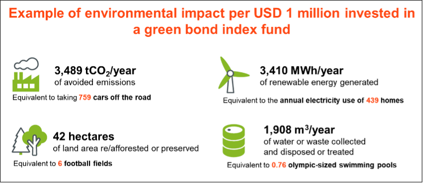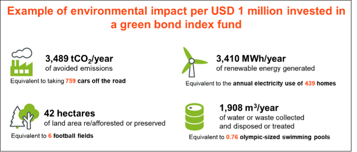 The transparency that investors enjoy with impact reporting is a differentiating feature of green bonds. Every year, all green bonds must report the environmental metrics of the projects funded by their proceeds—a process usually overseen by a third party, such an auditor—which makes it possible for fund managers to determine the metrics of their funds as a whole. The chart below shows some examples of what a green bond fund can measure; they can also measure achievements such as green jobs created or water saved.