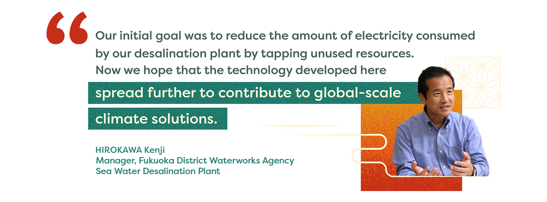 “Our initial goal was to reduce the amount of electricity consumed by our desalination plant by tapping unused resources,” says Kenji Hirokawa, manager at the Fukuoka District Waterworks Agency Sea Water Desalination Plant. “Now we hope that the technology developed here spread further to contribute to global-scale climate solutions.”