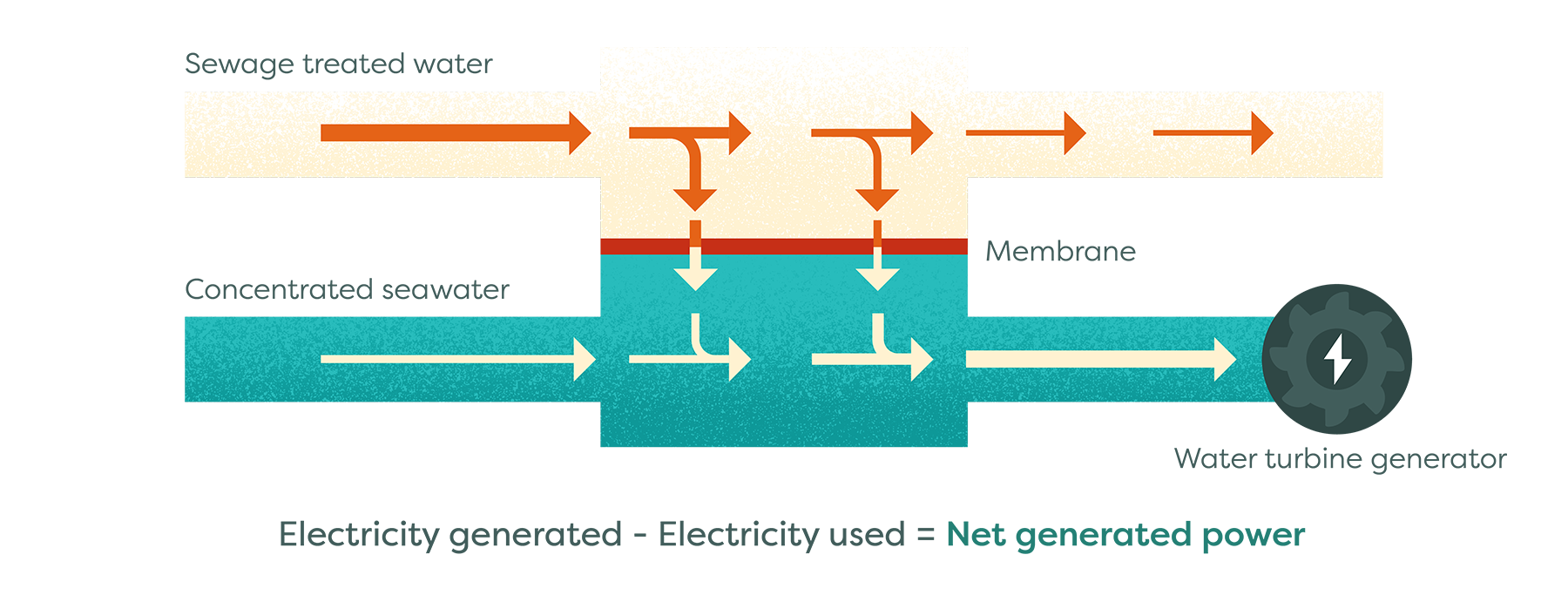 The technology uses the osmotic movement of freshwater into saltwater through a permeable membrane to create a pressure differential force that can be used to turn an electric turbine. With the potential to generate clean baseload energy virtually all year round whenever there is a supply of fresh water and salt water (such as where rivers meet the ocean, or at desalination plants near sewage treatment plants), such osmotic systems can be crucial to our energy transition.[8]