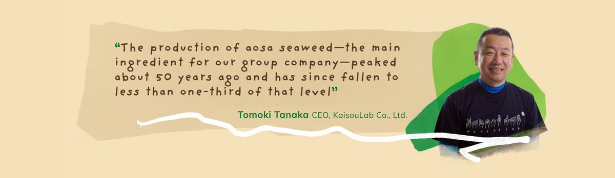 “Seaweed farming has long existed in Japan, but the production of aosa seaweed—the main ingredient for our group company—peaked about 40 years ago and has since fallen to less than one-third of that level,” says Tomoki Tanaka, CEO for KaisouLab Co., Ltd.