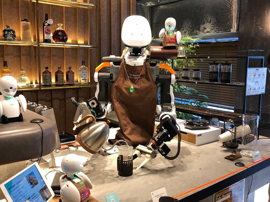 At the café, pilots greet customers at the entrance and take orders at their tables using OriHime robots, which are controlled remotely by mouse, hand, or eye movement. At the counter, a barista robot makes coffee in front of customers, which is later brought to their table.