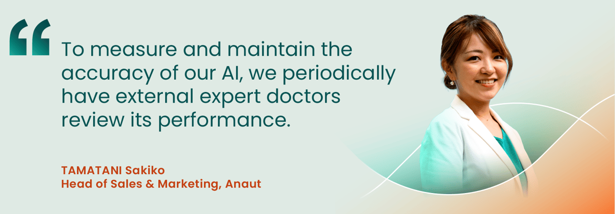 “We ensure the integrity of our data by collecting it only from hospitals with which we have completed an institutional review board approval process,” says Sakiko Tamatani, Head of Sales & Marketing at Anaut. “To measure and maintain the accuracy of our AI, we periodically have external expert doctors review its performance.”