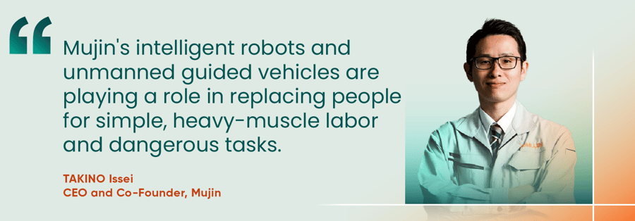 “As manpower shortages become increasingly severe, Mujin's intelligent robots and unmanned guided vehicles are playing a role in replacing people for simple, heavy-muscle labor and dangerous tasks,” says Mujin’s CEO and Co-Founder Issei Takino. “This frees people up to focus on high value-added tasks that only people can perform.”