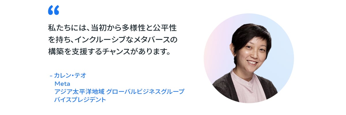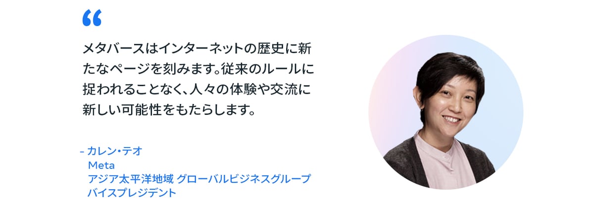 Metaのアジア太平洋地域 グローバルビジネスグループ バイスプレジデントのカレン・テオ氏は次のように述べています。「メタバースはインターネットの歴史に新たなページを刻みます。従来のルールに捉われることなく、人々の体験や交流に新しい可能性をもたらします。メタバースはやがて、ブランドや人々が交流する方法を再定義することになるでしょう。」