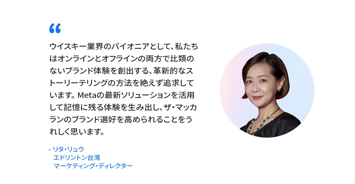 「ウイスキー業界のパイオニアとして、私たちはオンラインとオフラインの両方で比類のないブランド体験を創出する、革新的なストーリーテリングの方法を追求しています。Metaの最新ソリューションを活用して、記憶に残る体験を生み出し、ザ・マッカランのブランド選好を高められることをうれしく思います。」