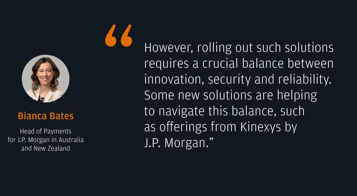 “Our clients want to make sure that their payments are seamless, safe and secure,” says Bianca Bates, Head of Payments for J.P. Morgan in Australia and New Zealand. “That’s why we’re so focused on security and reliability.”