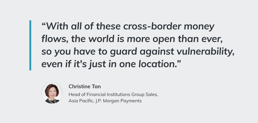 Sending money across borders is particularly challenging due to various factors such as unique regulatory frameworks, cybersecurity threats, and the potential for delays or failed transactions. However, in certain markets, there are additional, nuanced obstacles, according to Christine Tan, Head of Financial Institutions Group Sales, Asia Pacific, J.P. Morgan Payments.