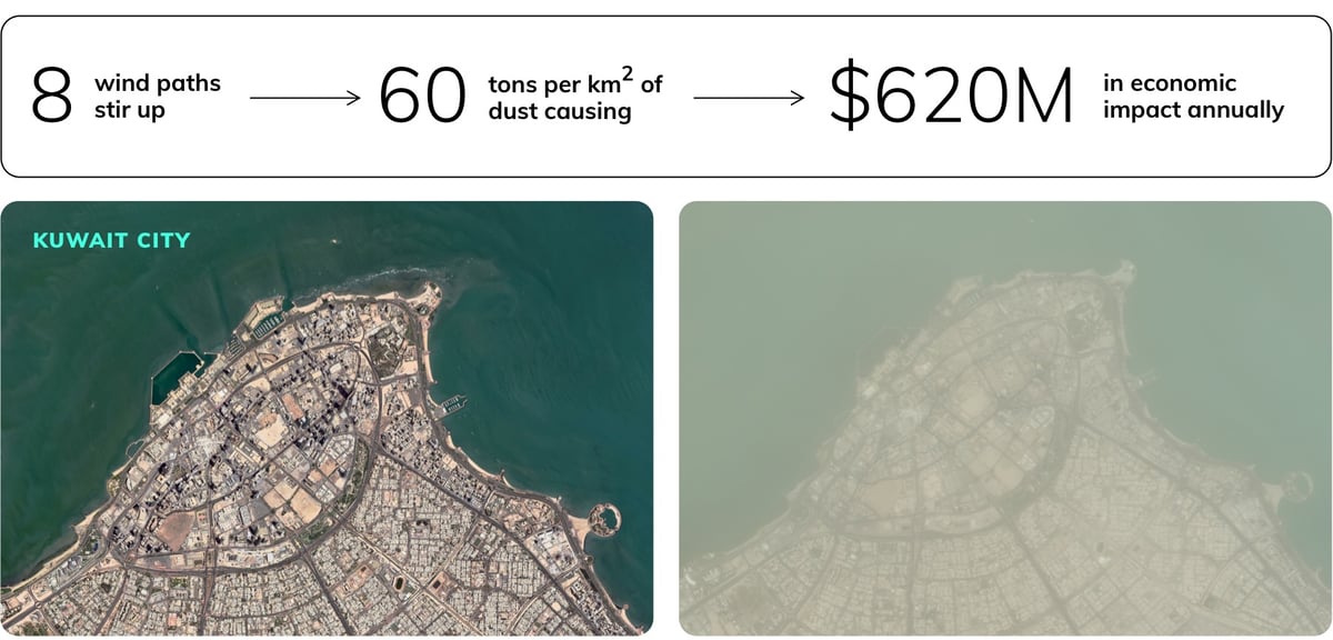 One country that is all too familiar with such storms is Kuwait. The Middle Eastern nation is host to eight wind paths that stir up to 60 tons per square kilometer of dust from Iraq. The dust and sand travels 250 kilometers to reach the Kuwait borders, and spread as far as Bahrain and Qatar too, impacting urban and coastal communities alike. Kuwait estimated that the health, environmental and economic problems that result amount to about 190 million Kuwait Dinars (US$620 million) annually.