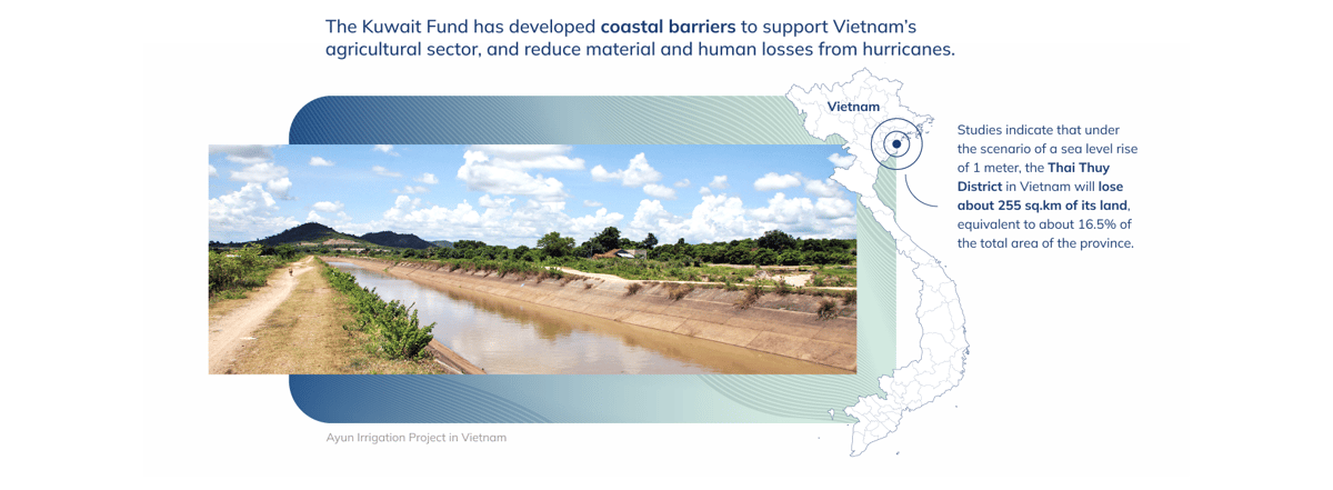 In Vietnam, too, the Fund is working to support coastal infrastructure in the face of rising sea levels. It has developed a sea barrier, three river barriers, and a bridge in the Thai Thuy District, one of the provinces most vulnerable to natural disasters, to support the agricultural sector in the region and reduce material and human losses resulting from hurricanes. These improvements will contribute to population stability and encourage investments in the agricultural sector and other related activities, creating additional job opportunities.