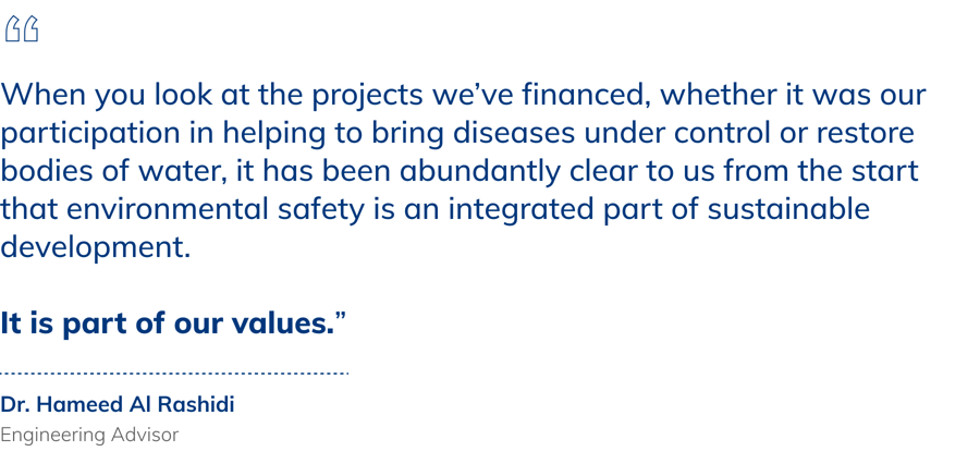 “The protection and improvement of the environment have always been a major concern to the Fund and are critical, prerequisite elements in determining whether the Fund will participate in financing a project in any development sector,” says Dr. Hameed Al Rashidi, Engineering Advisor. “This is natural, given that the rapid economic growth taking place in many developing countries carries a potentially negative impact on the environment and human welfare in those countries. Hence, such growth needs accompanying reforms that carefully scrutinize the environmental impact of each project and ensure all the necessary measures are taken.”