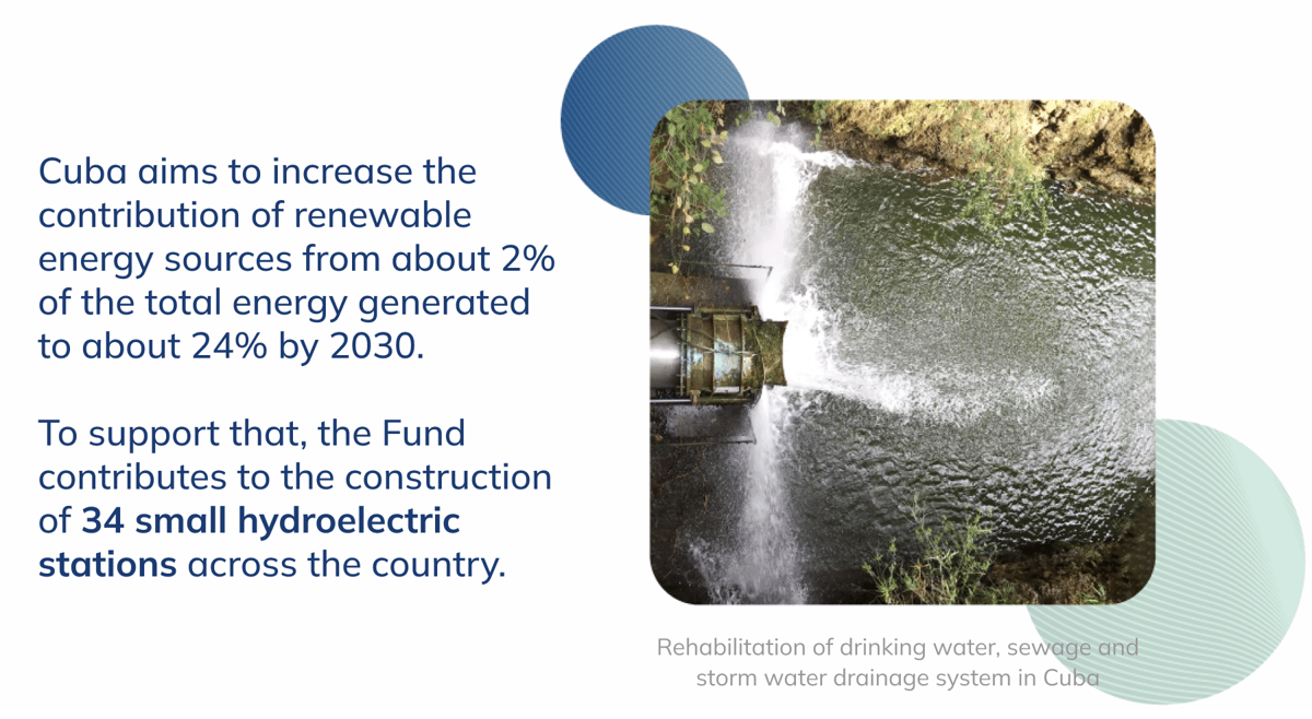 In Cuba, the Fund is supporting the construction of 34 small hydroelectric stations across eleven governorates in the country, raising the efficiency of electrical energy generation and supply in remote areas and making them more sustainable to live and work in. The project also includes supporting scientific research and training centers in renewable energies.