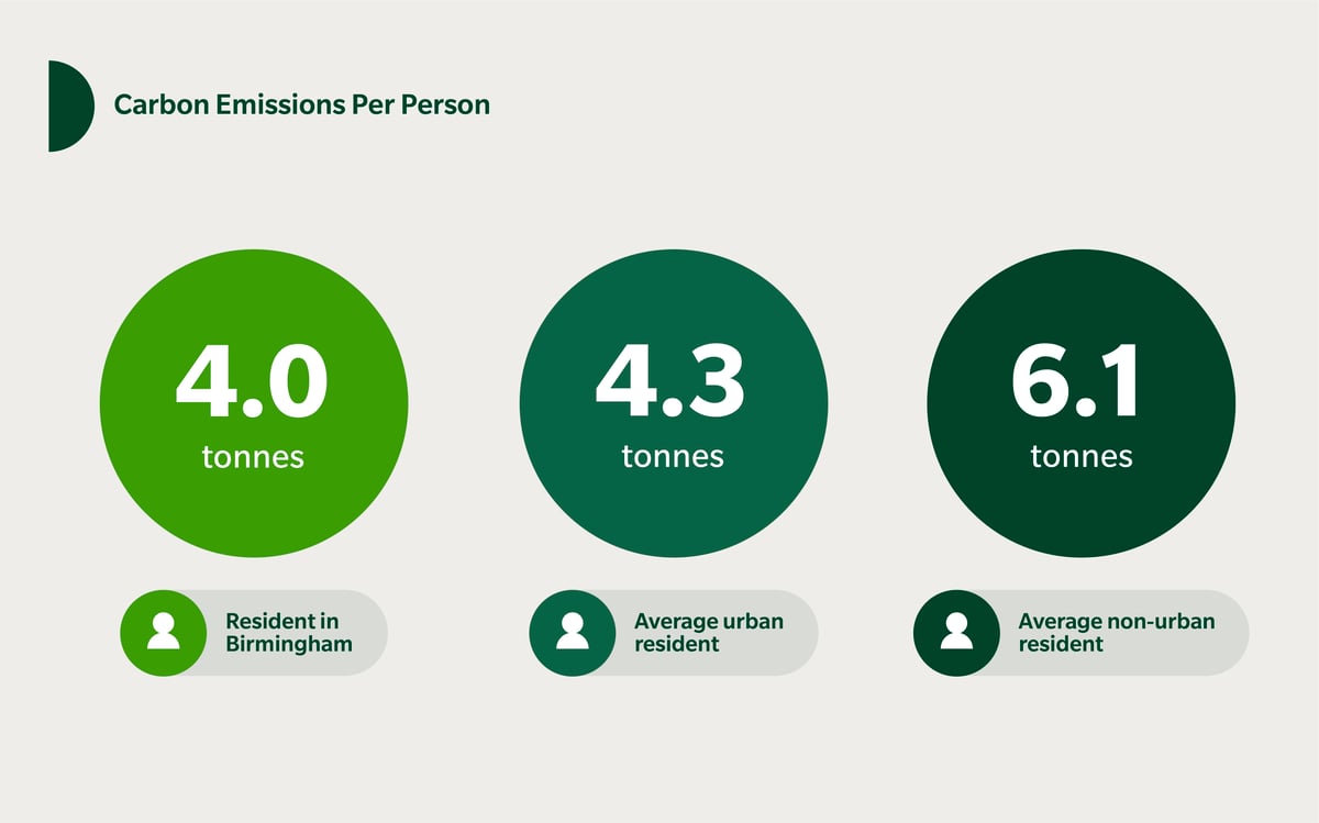 Local authorities in Birmingham recognise the critical importance of better, cleaner transport to the city’s continued economic growth, and are planning to make its local transport carbon-neutral by 2030. Birmingham already produces less CO2 per capita than most UK cities—4 tonnes per capita (tpc), compared to a national average of 4.3 tpc—according to Centre for Cities.
