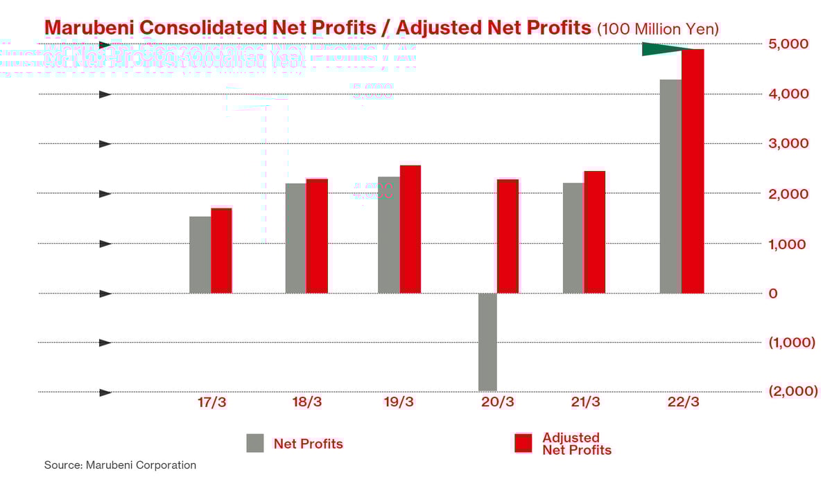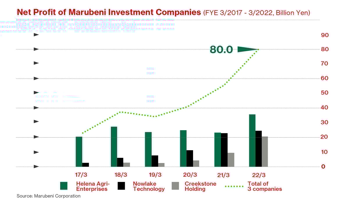 Marubeni shares soared in the months that followed—driven by record profits in FY21 and drawing on a sound business model and successful investments in the US including Helena Agri-Enterprises and Creekstone Holding.