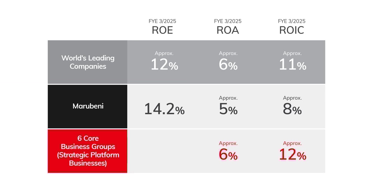 Marubeni plans ¥1.2 trillion of ¥1.7 trillion in new investment into these platforms, says they deliver 12% ROIC vs 8% company-wide, and is also funding ¥100 billion in long-term “seed planting” for post-2030 growth.
