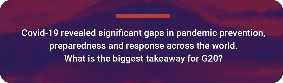 And financing is very, very important. Since Italy’s G20 presidency, the G20 has initiated a high-level panel to discuss global health governance as well as financing needs, including ways to better prepare for future pandemics. How can we as a group of the 20 biggest economies in the world better support the existing mechanism: the World Health Organization, whether in terms of mobilizing resources, upsizing or providing emergency financing through multilateral development banks, as well as financing the vaccine?