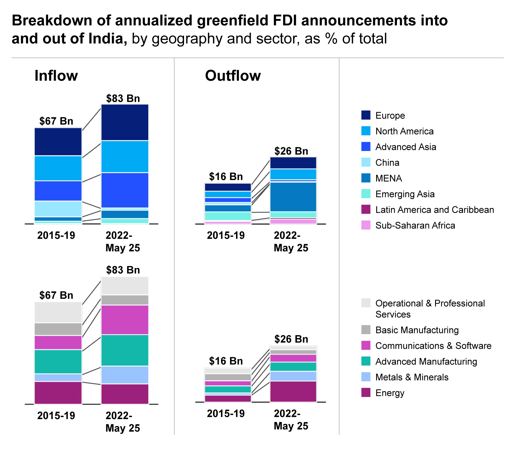 The picture is different for India, which has become the top emerging-market destination for announced FDI—not just for Asia’s FDI, but globally. Since 2022, India’s greenfield FDI inflow announcements have grown 24% to around $83 billion a year. India’s announced inflow composition is remarkably balanced geographically: roughly equal shares of announced investment are coming from North America, Europe, and advanced Asia, reducing India’s reliance on any single partner or region.