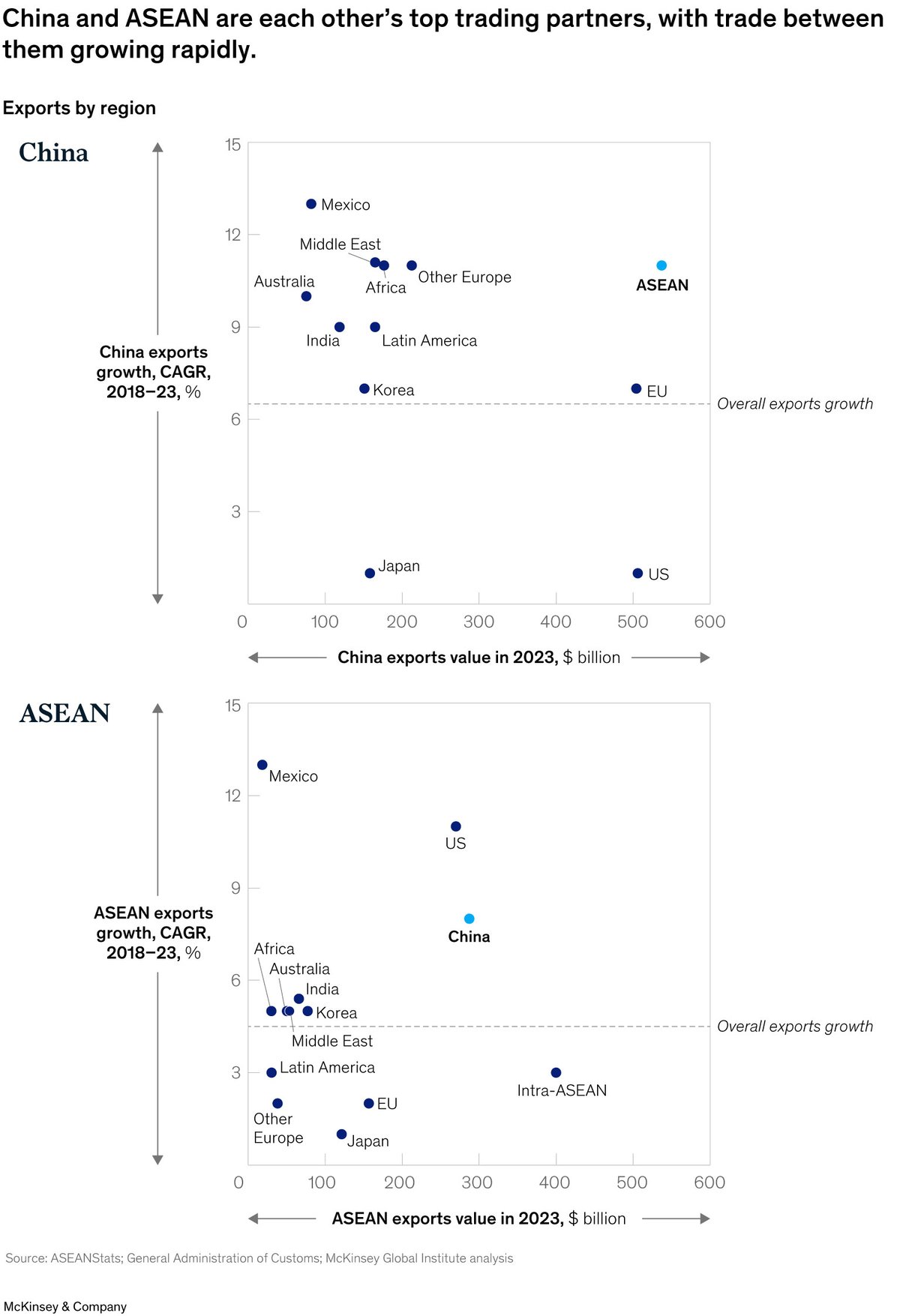 The deepening economic interdependence of China and the Association of Southeast Asian Nations (ASEAN)—each other’s largest trading partners—stands out. ASEAN accounted for 15% of China’s total trade in 2023, up from 10% in 2010, while China accounted for 20% of ASEAN’s total trade in 2023, up from 12% in 2010. Further integration could be propelled by the Regional Comprehensive Economic Partnership, the world’s largest free-trade agreement, which covers 15 economies in the Asia-Pacific region.