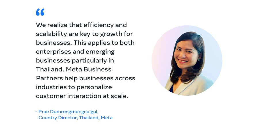 "We realize that efficiency and scalability are key to growth for businesses. This applies to both enterprises and emerging businesses particularly in Thailand. Meta Business Partners help businesses across industries to personalize customer interaction at scale,” says Prae Dumrongmongcolgul, Country Director, Thailand, Meta “Whether it is managing hundreds of messaging volume, manage orders and fulfilment, businesses can leverage the tool of our partners to maximize the potential of business messaging in the entire customer life cycle"