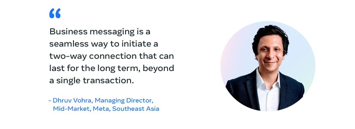 “Consumers are becoming increasingly discerning and like to experiment with products and services of many businesses at the same time,” says Dhruv Vohra, Managing Director, Mid-Market, Meta, Southeast Asia. “Our research shows 80% of consumers plan to continue using messaging to interact with businesses. Increasingly, they want to be associated with brands and businesses that they feel a connection with, care about and can trust. Business messaging is a seamless way to initiate a two-way connection that can last for the long term, beyond a single transaction.”