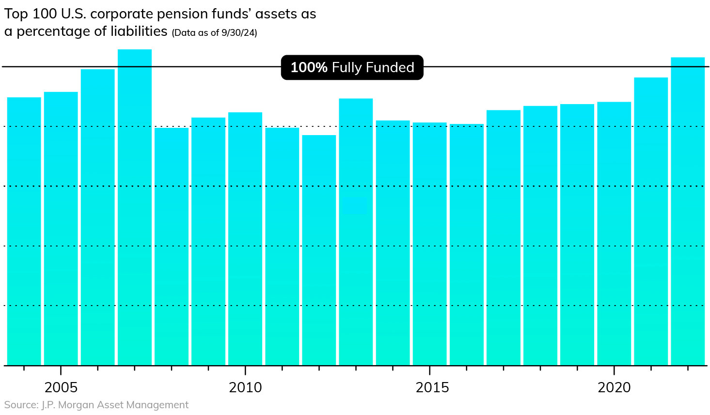 The flush status of legacy plans is opening up new opportunities. In the US, corporate pension plans represent a $3 trillion pool of assets. MetLife Investment Management estimates that Russell 3000 companies with defined benefit pensions were sitting on a surplus worth a combined $62 billion as of October 2024.