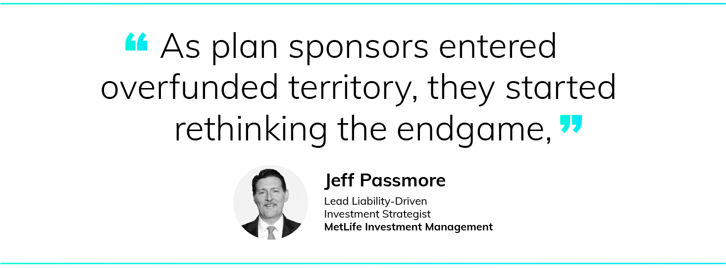 “A lot of people think pensions are dinosaurs and that they’ve completely disappeared,” says Jeff Passmore, Lead Liability-Driven Investment Strategist at MetLife Investment Management. “But they’re still a big deal. Strong funding levels have allowed pension managers to de-risk, and for the first time, their fixed income allocations have surpassed stock holdings. The landscape has changed.”