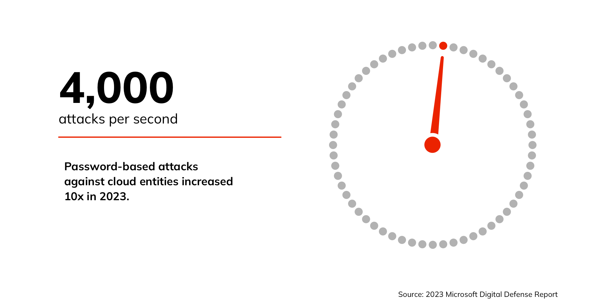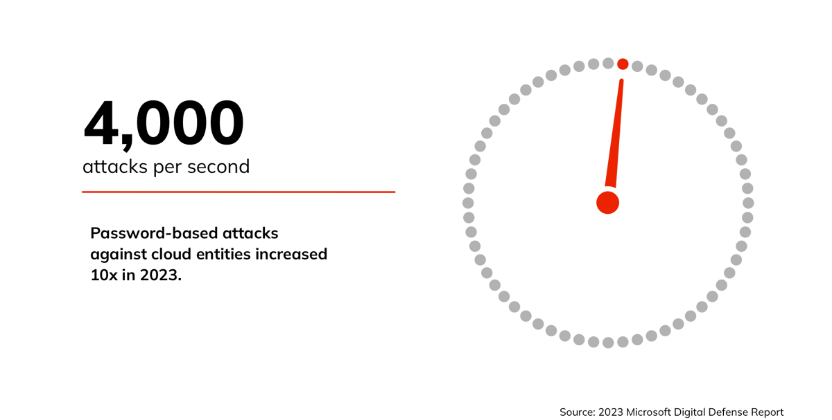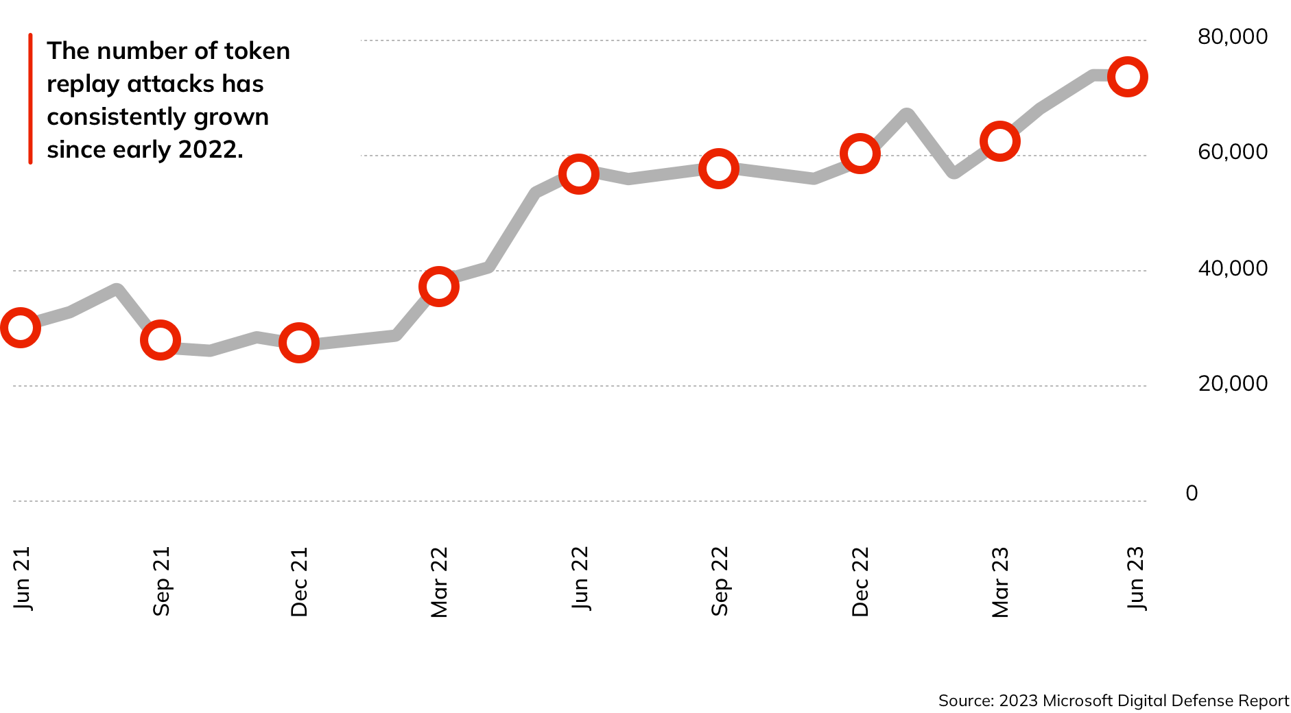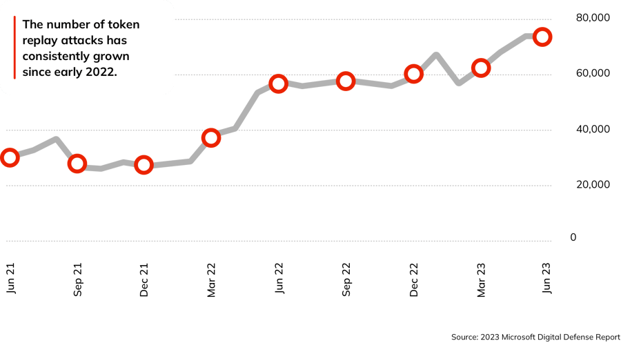 In addition to battling the record-breaking spike in traditional cyberattacks, security teams must ward off new, more sophisticated threats like token replay attacks, where attackers go beyond compromising user credentials and utilize token theft for the purpose of getting into organizations’ environments. The number of token replay attacks has grown since the start of 2022, and has doubled in the last 12 months.