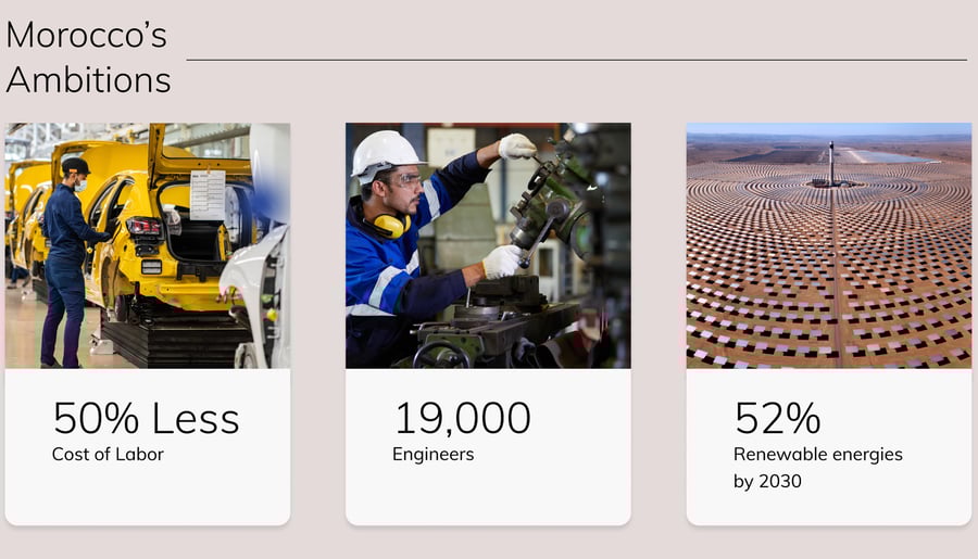 And companies can plan to stay for the long-term, thanks to Morocco’s pioneering investments in clean energy coupled with a young and skilled workforce. More than 50 large-scale renewable projects have been implemented to date, including one of the world’s largest concentrated solar plants, and some of the largest wind farms in Africa. Meanwhile, the median age of its population is 29 – compared to 38.5 in the US and 44 in the European Union – with a cost of labor as low as half of China’s, according to a report from FDI Intelligence.