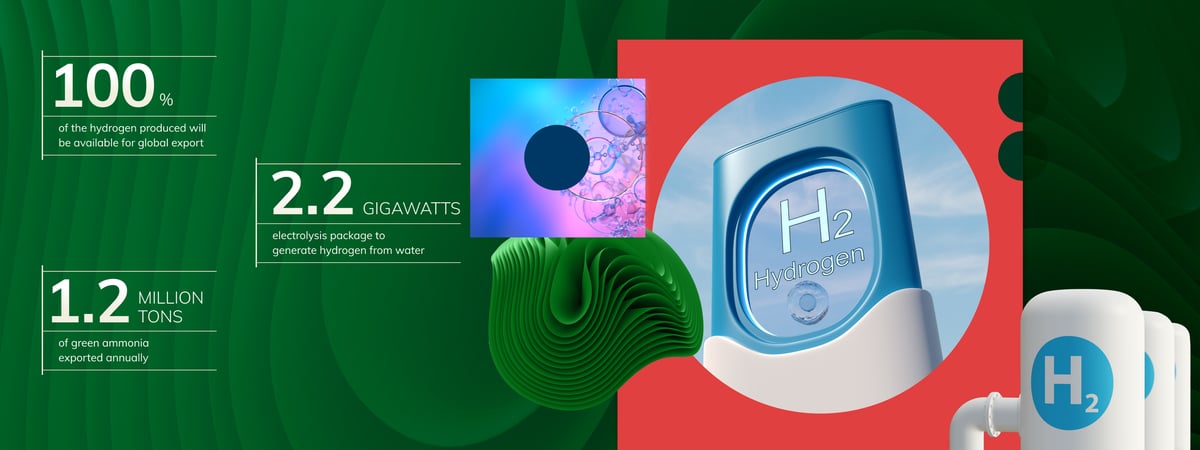 Once the plant at NEOM is operational by 2026, 100% of the green hydrogen produced will be available for global export, in the form of ammonia, through an exclusive long-term agreement with Air Products.